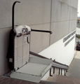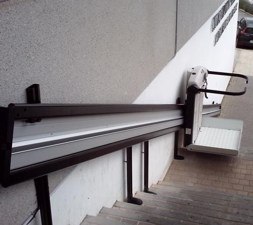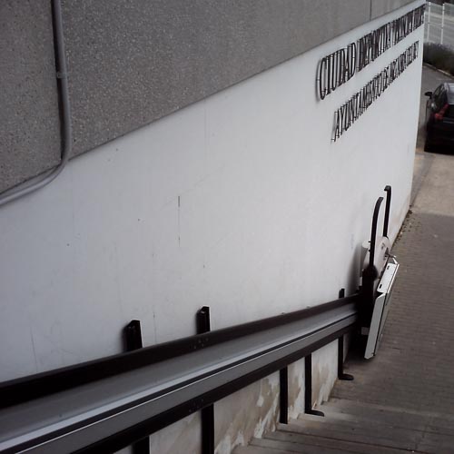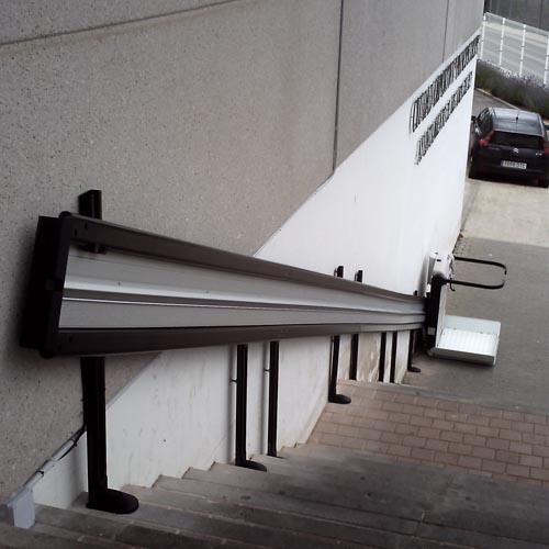 Esta plataforma ha sido instalada en un tramo recto con rellano intermedio para conectar el parking con el interior del recinto. Esta V64 está instalada en el exterior lo que no supone problema pues está preparada para soportar las inclemencias del tiempo.