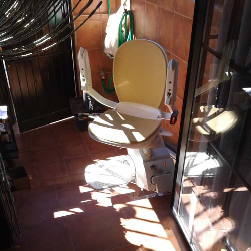 Esta silla afronta un desnivel de un par de escalones que acceden al interior de la casa en una escalera recta. Es un pequeño desnivel pero un gran obstáculo para personas mayores o con movilidad reducida. Este tipo de sillas son la mejor solución para casas unifamiliares ya que su calidad precio es inmejorable. Se puede montar sin necesidad de obras y puede estar montada en una jornada laboral.