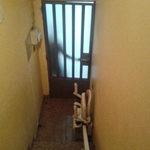 Este modelo Acorn Curve supera con facilidad una escalera curva muy estrecha. Instalada en la parte izquierda para poder salvar un pilar que encontramos a mano derecha. Su aparcamiento tanto superior como inferior se acopla perfectamente a la pared con su plegado extraplano cuando se encuentra en reposo, para tener el máximo espacio libre y no interrumpir el paso de la puerta y asegurar el paso de otros miembros del hogar sin obstáculos.
