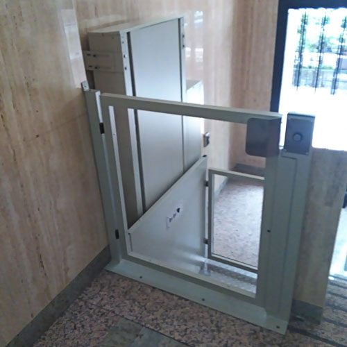 En esta comunidad de vecinos hemos instalado una plataforma de elevación vertical superando unos pocos escalones que separan el nivel de la calle a la zona del ascensor.