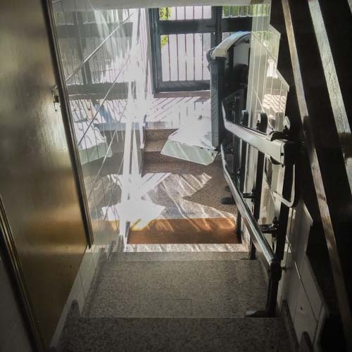 Esta plataforma está situada en el interior de una casa multiplanta para dar acceso a usuarios con silla de ruedas o movilidad reducida a la zona del ascensor, a pesar de la estrechez de esta escalera la V65 pasa sin problemas garantizando un desplazamiento cómodo y seguro.