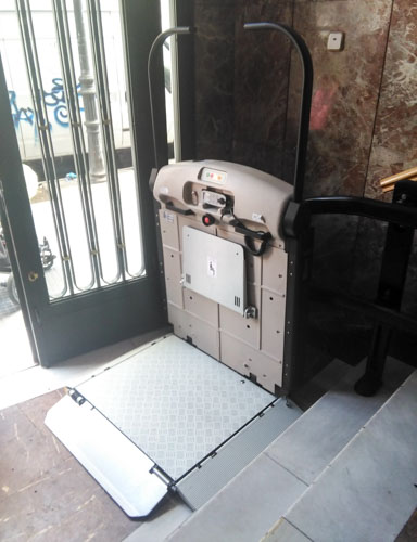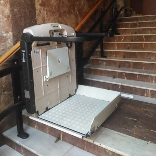 Esta V65 supera un tramo recto de escalera con un rellano intermedio, enlazando el nivel de la calle con la zona del ascensor. Esta es una de las mejores opciones para personas con silla de ruedas, en esta ocasión nuestro cliente nos ha pedido un pequeño asiento de forma opcional, acoplándose a la plataforma para que también lo puedan utilizar personas mayores o impedidas.
