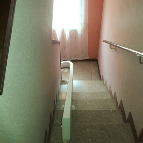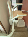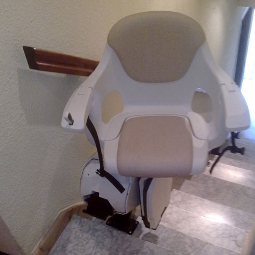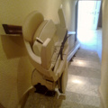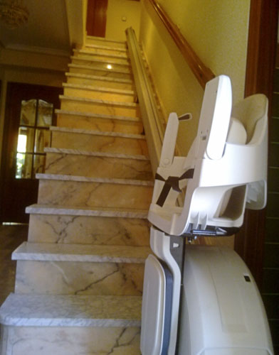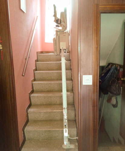 Esta silla se encuentra en el interior de una casa, para salvar un tramo recto de escalera que transporta al usuario de la planta baja al primer piso. Sus viajes serán silenciosos y confortables, su asiento gira para tener un desembarque seguro. Cuando está en reposo su tamaño se reduce al máximo, gracias a que se pliega sobre sí mismo el asiento, el apoyabrazos y reposapiés dejando la silla totalmente plana y así no obstaculiza el paso al resto de familiares.