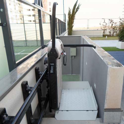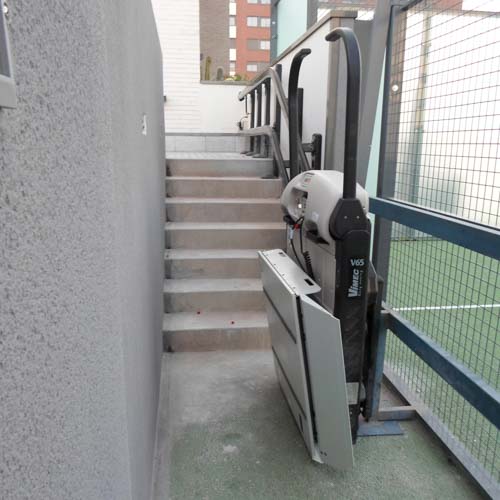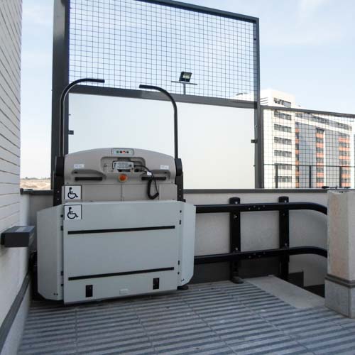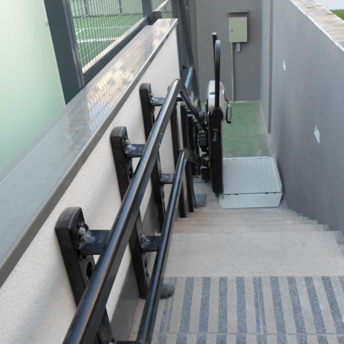 Esta plataforma recorre un tramo recto de escalera para dar acceso a los usuarios con silla de ruedas a la zona del la pista de padel. Haciendo un edificio accesible para todos los usuarios, y así, puedan disfrutar de las zonas comunes de una forma libre, autónoma y segura.