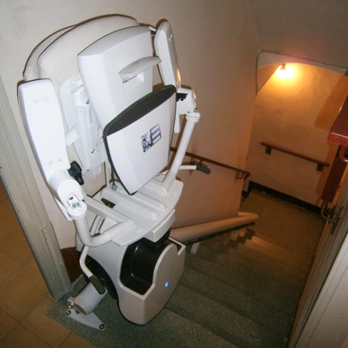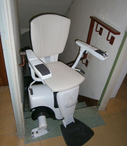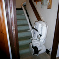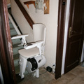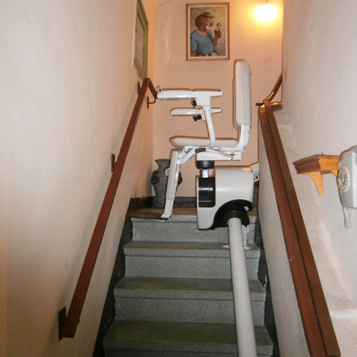 La silla afronta una escalera en forma de L es decir, dos tramos rectos y un rellano intermedio, permitiendo a nuestro cliente pasar de la planta baja al primer piso de una forma segura y con total autonomía.