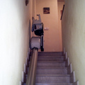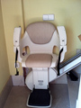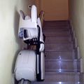 En este caso, nos encontramos una escalera recta con una pendiente constante que conduce el primer piso a la planta baja. Su funcionamiento es fácil, en el apoyabrazos encontramos un mando que si lo mantenemos accionado pone en funcionamiento la silla. Si durante su recorrido tropieza con algún obstáculo para automáticamente. El asiento es giratorio para que el desembarque y el embarque sean más cómodos y seguros.