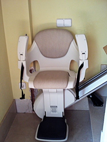 En este caso, nos encontramos una escalera recta con una pendiente constante que conduce el primer piso a la planta baja. Su funcionamiento es fácil, en el apoyabrazos encontramos un mando que si lo mantenemos accionado pone en funcionamiento la silla. Si durante su recorrido tropieza con algún obstáculo para automáticamente. El asiento es giratorio para que el desembarque y el embarque sean más cómodos y seguros.