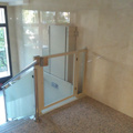 En esta instalación la plataforma tiene que salva unos pocos escalones que llevan a la zona del ascensor. La Izaro está concebida para interior y puede superar barreras arquitectónicas de hasta 2m, siempre en vertical. Su principal ventaja radica en que no invade la escalera y puede utilizarla tantas veces se necesite al día, garantizado su fiabilidad.