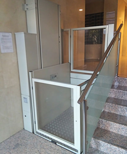 Nos encontramos con una plataforma ubicada en la entrada de una comunidad de vecinos, instalada en el lado izquierdo en una escalera recta que conectan el ascensor con la calle.