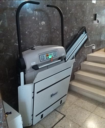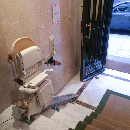 Plataforma salvaescaleras modelo V64 instalada en el interior de un edificio en Móstoles un municipio que pertenece a la Comunidad de Madrid.
