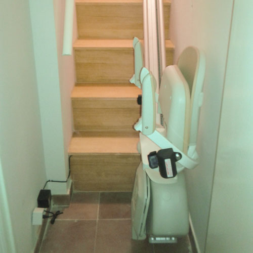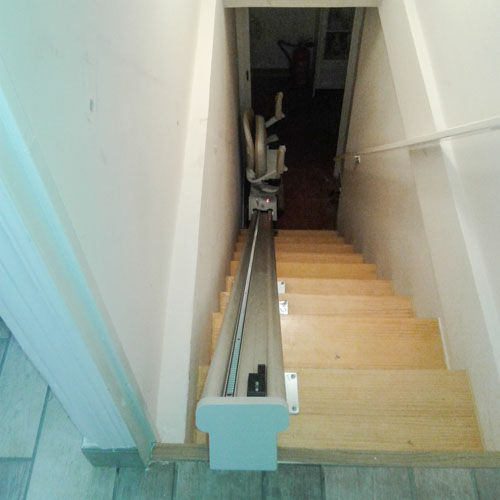 La Acorn supera un tramo recto de escalera que conduce al usuario del primer piso a la planta baja. Pese a tratarse de un tramo de escalera bastante estrecho, la silla pasa sin problemas adaptándose al máximo a su anchura. Además, su plegado extraplano supone un gran ahorro de espacio sobre la escalera cuando está en reposo.