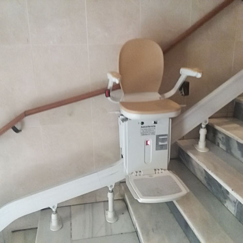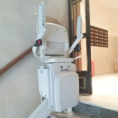 Esta silla salva una escalera recta con rellanos intermedios, transportándonos desde el nivel de la calle a la zona del ascensor. Sus viajes serán cómodos, posee un mecanismo de arranque y parada suave, su funcionamiento es sencillo la silla lleva un mando incorporado en el reposabrazos y solo tienes que mantenerlo pulsado para que la silla se ponga en funcionamiento, si encuentra algún obstáculo tiene sensores anticolisión con desconexión automática.