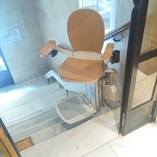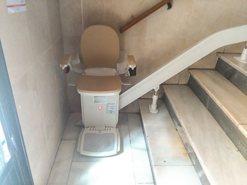 Silla salvaescaleras modelo Acorn 180 ubicada en el interior de un edificio en la población de San Fernando de Henares.