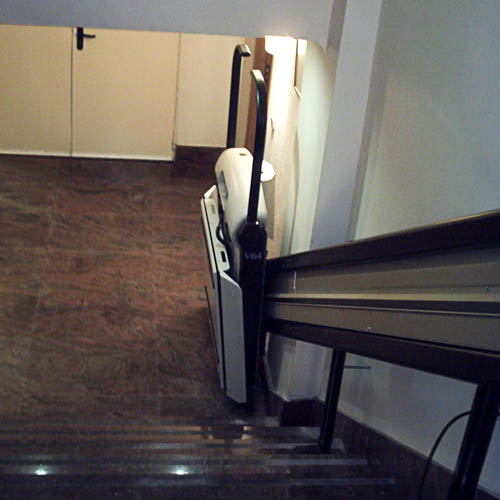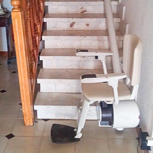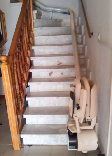 Esta silla recorre una escalera curva sin rellanos intermedios recorriendo la parte interna de la escalera conectando la planta baja con el primer piso.