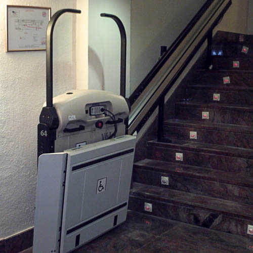 Esta plataforma tiene que salvar una escalera recta que conecta un salón con otro del piso superior. Esta plataforma es la solución perfecta para cumplir con la normativa de accesibilidad a lugares públicos, ya que no se necesita obras ni cambios estructurales de la escalera y está montada en poco tiempo, su calidad-precio es excepcional.