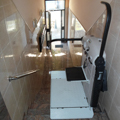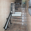Es muy común que encontremos en las comunidades de vecinos unos pocos peldaños que impiden el acceso a la zona del ascensor. Gracias a esta plataforma se consigue conectar el nivel de la calle con el ascensor a personas con silla de ruedas o con movilidad reducida. En este caso, la plataforma posee una sillita para que también lo puedan utilizar el resto de vecinos que lo necesiten.