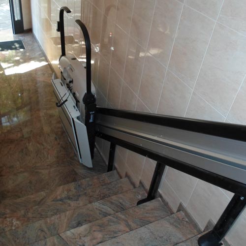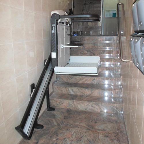 Plataforma salvaescaleras modelo V64 ubicada en el interior de un edificio en Torrelodones un municipio que se encuentra al noroeste de Madrid.