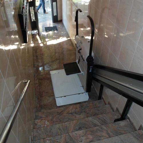 Es muy común que encontremos en las comunidades de vecinos unos pocos peldaños que impiden el acceso a la zona del ascensor. Gracias a esta plataforma se consigue conectar el nivel de la calle con el ascensor a personas con silla de ruedas o con movilidad reducida. En este caso, la plataforma posee una sillita para que también lo puedan utilizar el resto de vecinos que lo necesiten.