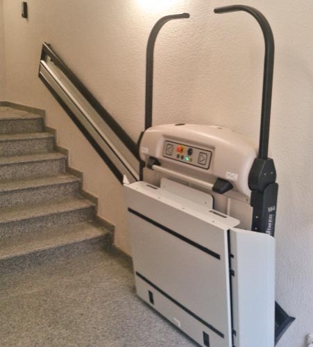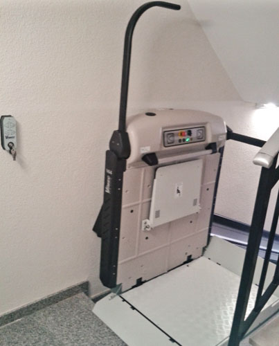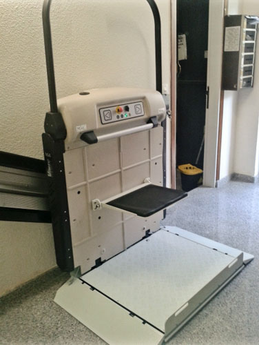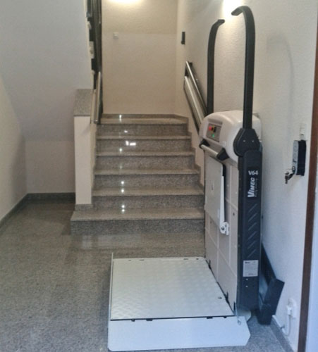 La V64 es la mejor opción para solucionar barreras arquitectónicas en escaleras rectas, para personas con silla de ruedas. En este caso la plataforma salva un tramo corto de unos 6 escalones, es un pequeño desnivel para cualquier persona pero una gran barrera para personas con silla de ruedas, ya que sin esta plataforma sería imposible poder superar este tramo.