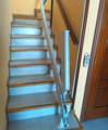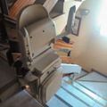 La Silla Acron 180 recorre una escalera curva que nos transporta de la planta 0 hasta la primera planta o viceversa. En este caso, tenemos un elemento complementario, hemos instalado una guía articulada que permite que la silla llegue al punto ideal para facilitar el embarque del usuario y cuando la silla sube la guía se pliega automáticamente sobre sí misma para no entorpecer el paso en el pasillo.