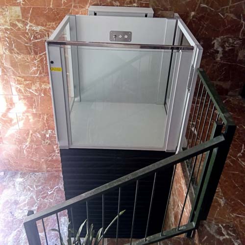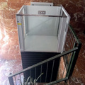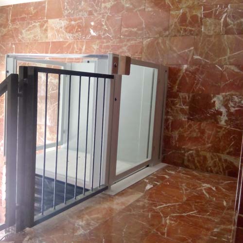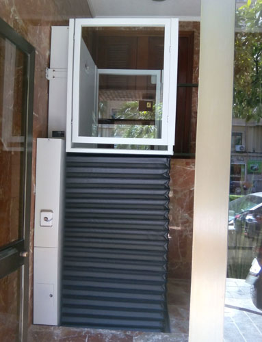 Plataforma vertical Izaro ubicada en el zaguán de una comunidad de vecinos en Velilla de San Antonio una población que pertenece a la Comunidad de Madrid.