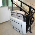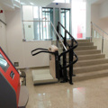 Esta instalación recorre un tramo recto de escalera. garantizando la accesibilidad en esta entidad bancaria. En la zona de aparcamiento inferior la plataforma gira y se posiciona fuera del paso de la escalera, para que cuando este en reposo tenga el mínimo intrusión sobre la escalera.