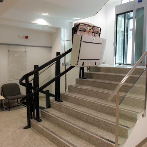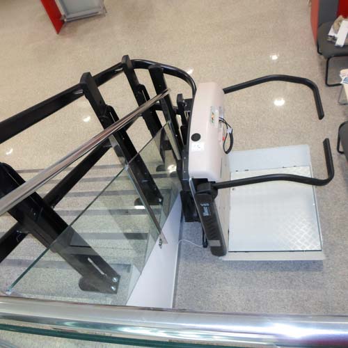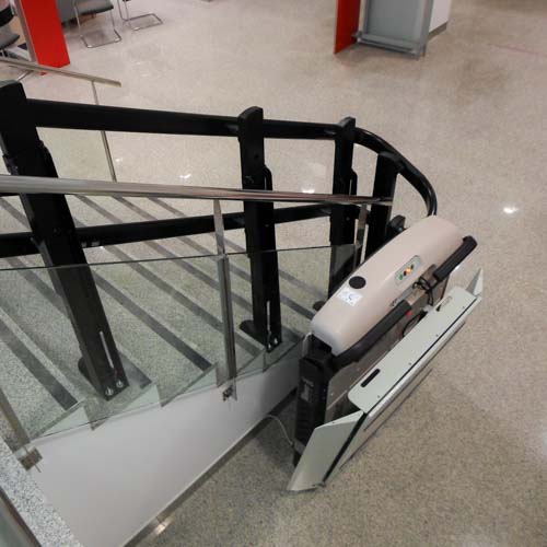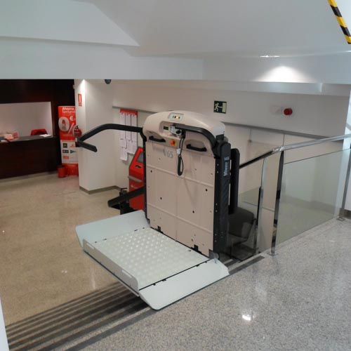 Esta instalación recorre un tramo recto de escalera. garantizando la accesibilidad en esta entidad bancaria. En la zona de aparcamiento inferior la plataforma gira y se posiciona fuera del paso de la escalera, para que cuando este en reposo tenga el mínimo intrusión sobre la escalera.