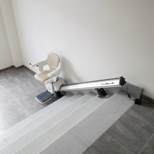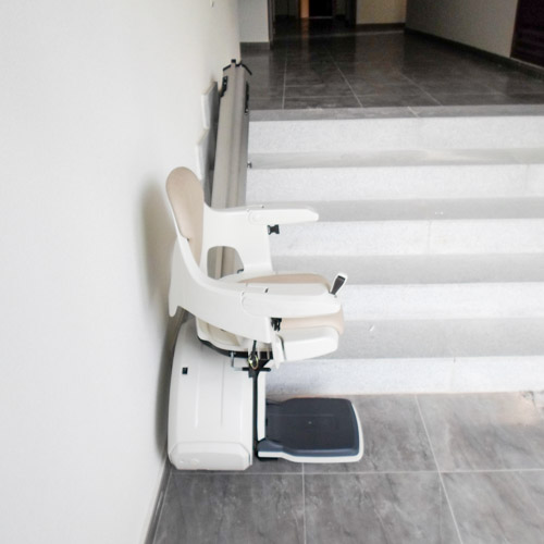 Silla salvaescaleras modelo Levante instalada en el interior de un edificio en el municipio de Villanueva de la Cañada (Madrid).
